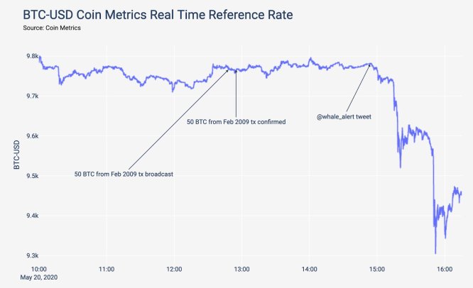 而昨日 50 枚比特幣轉移的消息曝光後,比特幣隨即由 9,768 急跌至 9,273 美元。