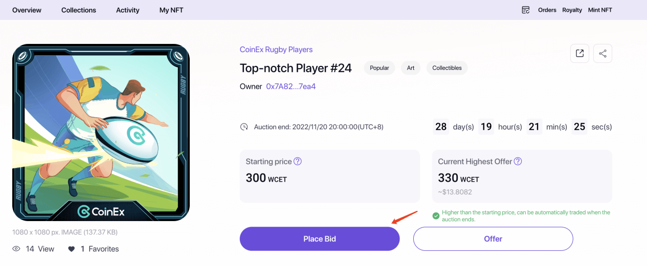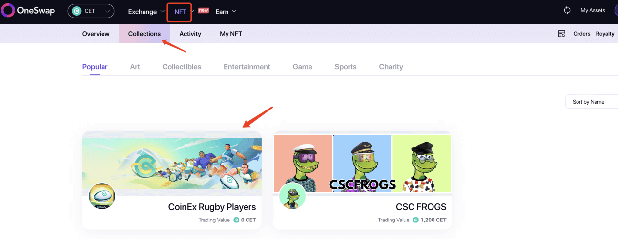 - 在 NFT 頁面中點擊「Collections」,選擇「CoinEx Rugby Players」;